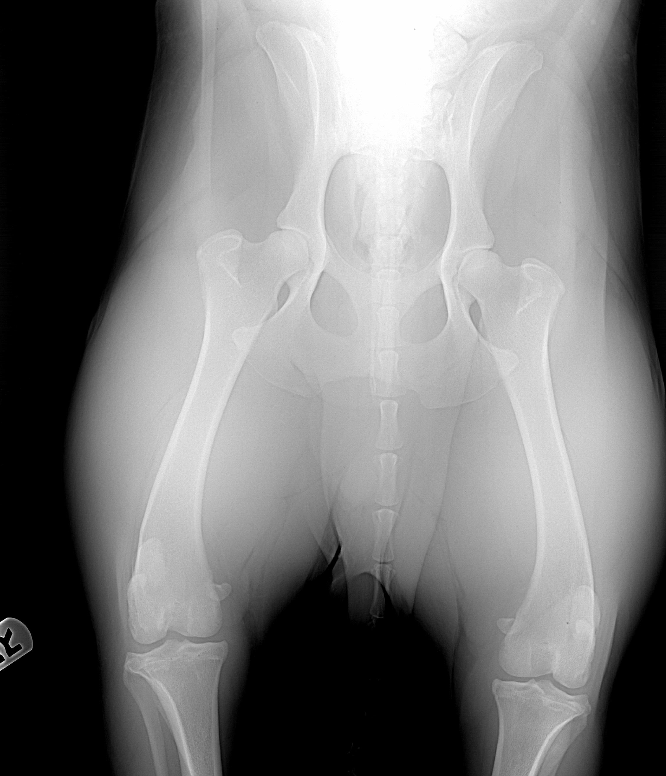 Barry's hips and elbows, taken on 1/7/08. My vet said he would be "shocked" if he did not get an Excellent but OFA gave them a Good. The third time they looked at them OFA changed one elbow from clear to Grade 1, however. We are disappointed. Both his littermates have gotten OFA Excellents,