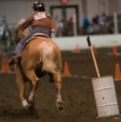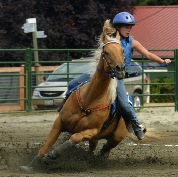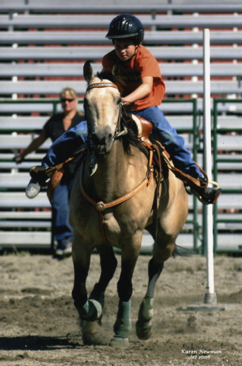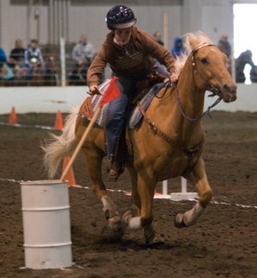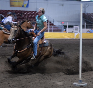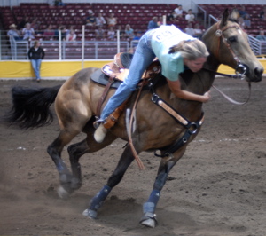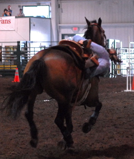 Becky entertaining the crowd at The Evergreen State Fair, getting popped up and over during Stake Race then holding onto the side of Wave's neck the whole way back. Wave even stopped in her lane, Becky was fine. :)